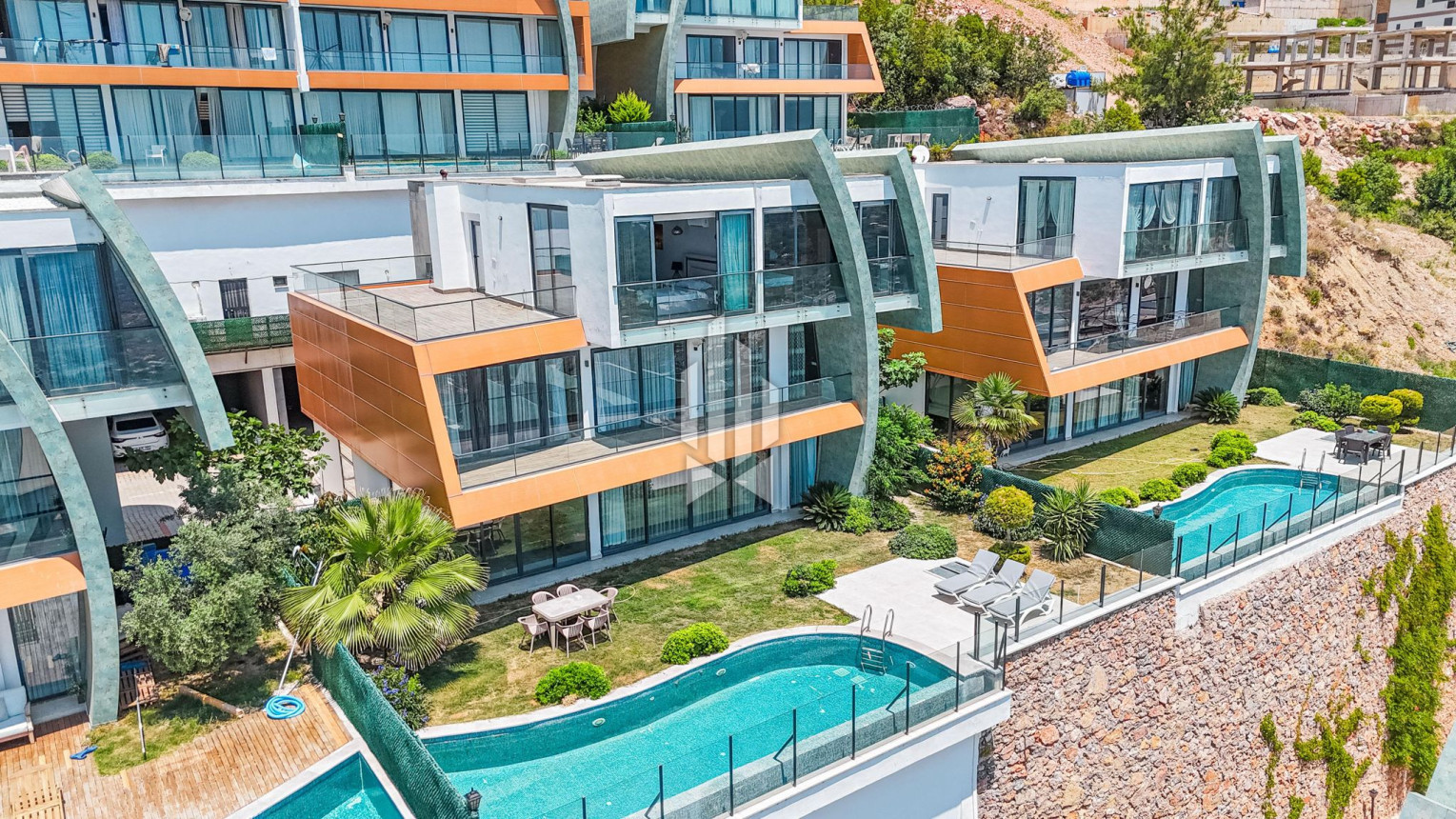 Вилла построена на участке 400 м², общая жилая площадь — 250 м². Дом 2016 года постройки, полностью готов к заселению и отличается удобной, семейной планировкой.